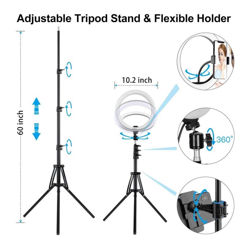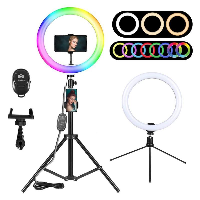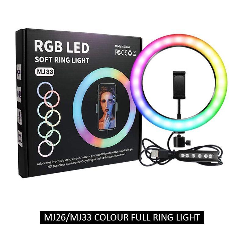 مع حاملة موبايل لتصوير السيلفي ring light الموديل: MJ33. المواد: ABS + PC. حجم القطر: 33 سم. حبات المصباح: 168 قطعة. درجة حرارة اللون: 3000 كيلو -6000 كيلو. المدخل: USB (PTZ + ملقط للهاتف). جهد المدخل: 5 فولت. التردد: 50-60 هيرتز. أقصى حد للطاقة: 25 واط. لون الضوء: ألوان باردة/ ألوان دافئة/ ألوان طبيعية + ألوان RGB. ممكن التحكم بالضوء: التحكم بدرجات الإضاءة وخلط الألوان، تأثيرات لونية خاصة. تعديل الإضاءة: 10-100% (10 درجات). لا تأتي مع ستاند.