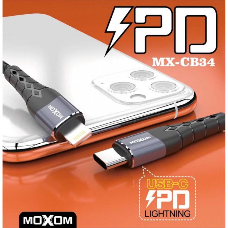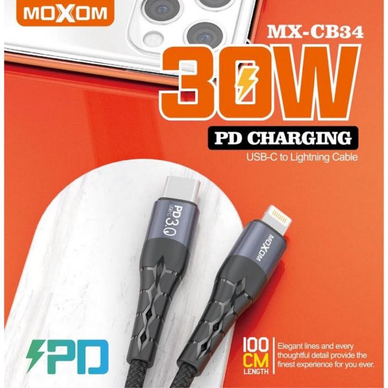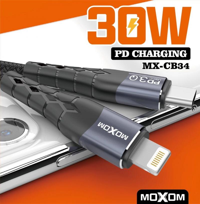 CB 34 كيبل شحن ونقل بيانات سريع من موكسوم بمقبس Lightning. طول الكيبل: 1 م. نوع الاتصال: Lightning. يحتوي على رأس معدني. كيبل مصنوع من مادة بقماش متين. المتانة ومقاومة السحب. تصميم دائري، حل التشابك. الشحن السريع PD، بسرعة 30 واط. سرعة نقل البيانات.