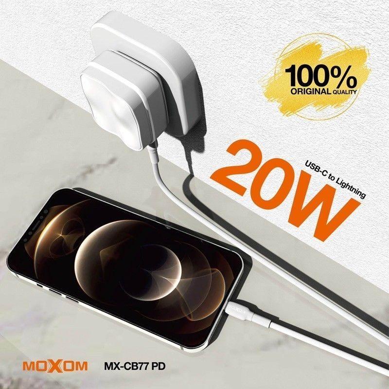 كيبل موكسوم CB 77 PD، من مدخل Type-C إلى Lightning، شاحن سريع بقوة 20 واط. العلامة التجارية: موكسوم. الموديل: MX-CB77. طول الكيبل: 1م. الطاقة: 20 واط. نوع الاتصال: كيبل من Type-C إلى Lightning.