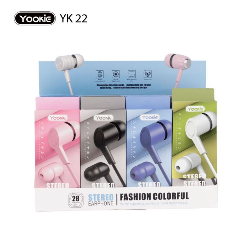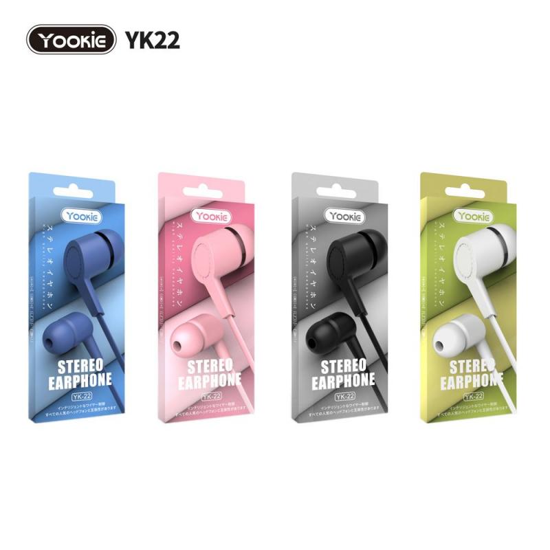 العلامة التجارية: YOOKIE. رقم الموديل: YK-22. النوع: في الاذن. نوع الاتصال: 3.5 ملم. التوصيل: سلكي. طول الكيبل: 1.2 م. المادة: البلاستيك. مادة الكيبل: TPE. يتضمن ميكروفون: نعم. استجابة التردد: 20 هيرتز - 20 كيلو هيرتز. مقاومة السماعة اليمين واليسار: 18 اوم ± 10%. حساسية السماعة اليمين واليسار: 90 ± 3 ديسيبل. الطاقة: 30-60 ميجا واط. 28 سماعة / صندوق.
