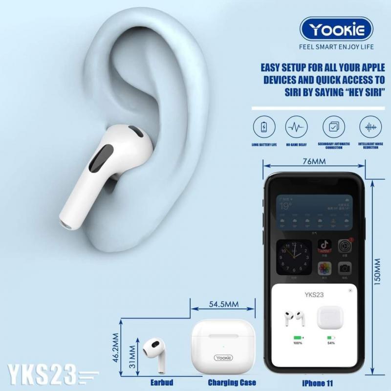 الماركة: YOOKIE. الموديل: YKS23. إصدار البلوتوث: 5.1 + EDR. مقاومة: 32 اوم. سعة سماعة الاذن: 30 ملي أمبير. سعة صندوق الشحن: 180 ملي أمبير. نطاق التردد: 2.4-2.48 جيجا هيرتز. تصميم مقاوم للعرق. اللون: الابيض.