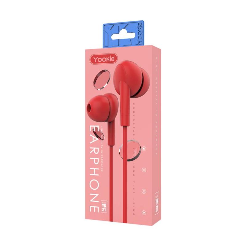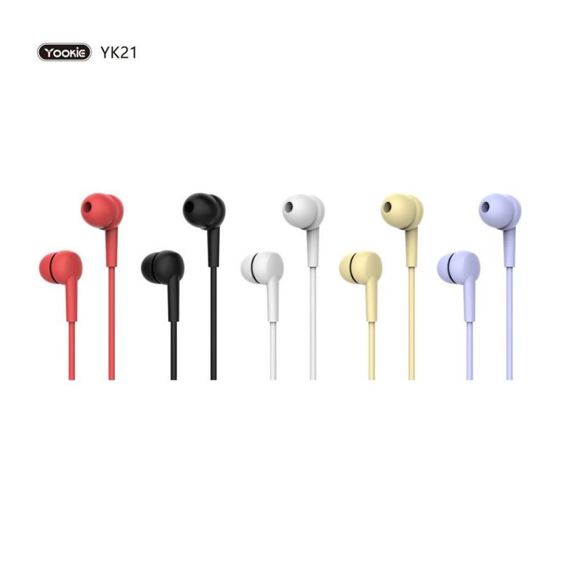 العلامة التجارية: YOOKIE. الموديل: YK21. النوع: داخل الأذن. التوصيل: سلكي. الموصل: 3.5 ملم. الطاقة: 20-60 ملي واط. يتضمن ميكروفون. مقاومة سماعة الأذن اليمين واليسار: 18 اوم ±10%. حساسية سماعة الأذن اليمين واليسار: 90±3 ديسيبل. التردد: 20 هيرتز – 20 كيلو هيرتز. اللون: اسود، ابيض، احمر، بنفسجي، اصفر.