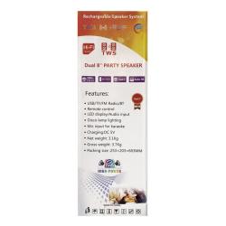 قوة المخرج (RMS): 110 واط. مصدر الطاقة: الشحن. عمر البطارية: 4 ساعات. وقت الشحن: 2 ساعة. دفق الموسيقى لاسلكيًا عبر البلوتوث. يدعم بطاقة الذاكرة: نعم. الأجهزة المتوافقة: موبايل، تابلت، لابتوب. عدد منافذ: 1 USB. صوت عالي وواضح. مدعوم بمكبر صوت جهير فائق يستخدم مغناطيس Neodymium للحصول على صوت عالي الدقة. يسمح لك الصوت عالي الدقة بتجربة صوت لا مثيل له. الاقتران السريع مع جميع الهواتف الذكية التي تدعم تقنية البلوتوث. يمكن تشغيل الموسيقى مباشرة من USB وTF CARD وجميع أنواع الاجهزة الصوتية من خلال جهاز Bluetooth في كيبل، ويسهل حملها في أي مكان وفي أي وقت.