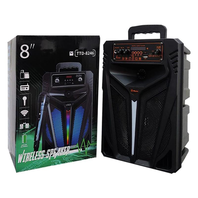 الموديل: TTD-8246. حجم السماعة: 8 انش. نوع الاتصال: بلوتوث. نوع المدخل: USB. سعة البطارية: 1500 ملي أمبير. معدل التردد: 40 هيرتز – 20 كيلو هيرتز. مسافة الاتصال حتى 10 م. المخرج: 10 واط. نسبة التشويش: ≥ 75 ديسيبل. إصدار البلوتوث: JL5.0. عمليات التحكم: زر. المادة: ABS (بلاستيك صديق للبيئة). مزود الطاقة: بطارية ليثيوم. وقت التشغيل: 6 ساعات. طريقة الشحن: USB. اللون: اسود. ماذا تحتوي العلبة: 1× بلوتوث سبيكر. 1× ميكروفون. 1× جهاز تحكم.