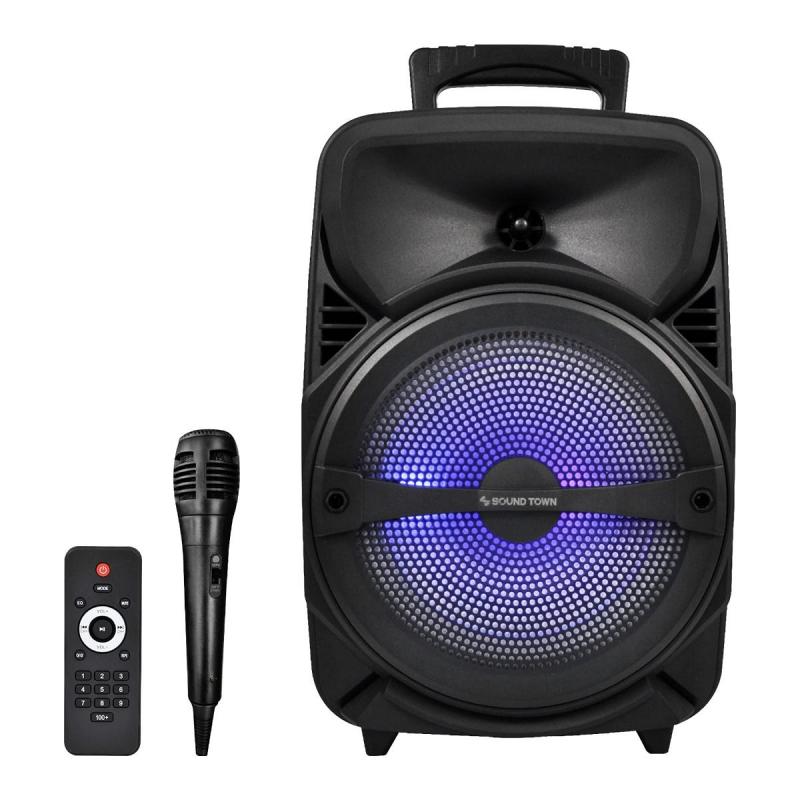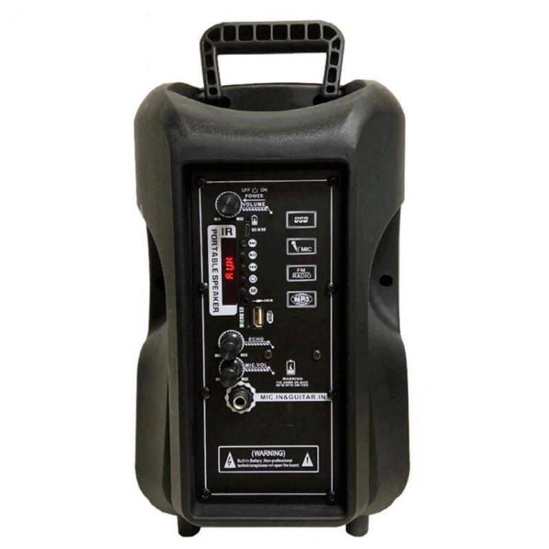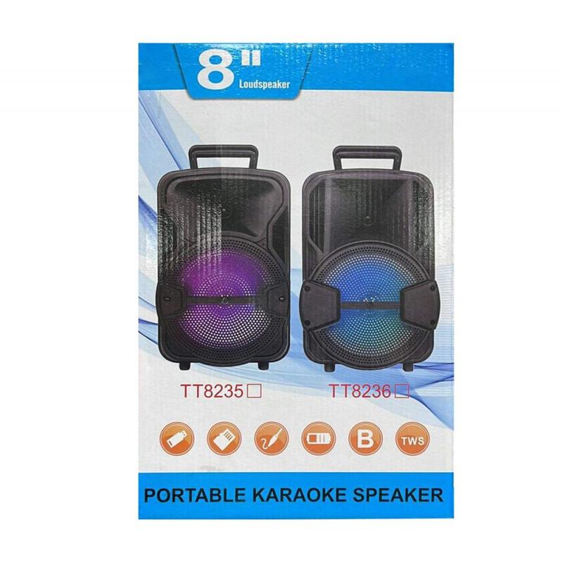 الموديل: TT8236. حجم السبيكر: 8 انش. المادة: بلاستيك. الاتصال: AUX, XLR, RCA, USB, Audio Line. طاقة المخرج / الحد الاقصى لطاقة المخرج: 55 واط / 80 واط. مزود الطاقة: بطارية ليثيوم بتيار متردد 110-220 / و 3.7 فولت - 7.4 فولت. بلوتوث مدمج مع مدخلات USB / SD / اوكس/ Mic وراديو FM. يحتوي على ميكروفون سلكي. بطارية مدمجة قابلة للشحن. تصميم سهل الحمل مع بنية متينة ومقبض لسهولة النقل. اللون: اسود.