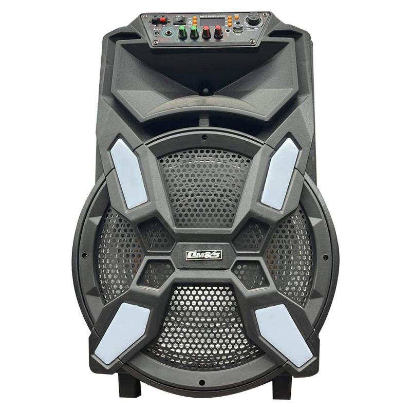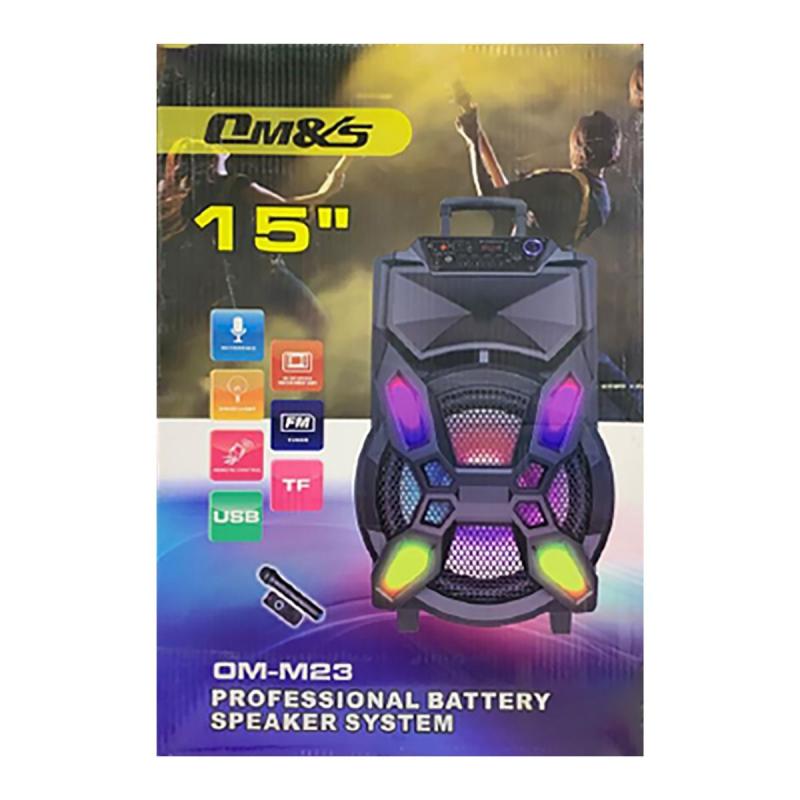 الموديل: OM-M23. حجم السبيكر: 15 انش. راديو/بلوتوث/USB/TF/FM. مدخل: 6.3 ملم. إصدار البلوتوث: 2.1. يعمل حتى مسافة 10 م. يدعم 3 مكبرات صوت. جهد المخرج: 100-240 فولت، 50/60 هيرتز. البطارية المدمجة: 2400 ملي أمبير. وقت الشحن: 4-8 ساعات. وقت التشغيل: 5 ساعات. يحتوي على شاشة LED/ مدخل صوت. مدخل ميكروفون للكاريوكي. جهاز تحكم عن بعد. حامل وعجلات. متوافق مع جميع الاجهزة التي تدعم البلوتوث مثل الاجهزة الذكية، التابلت، الايبود. اللون: اسود.