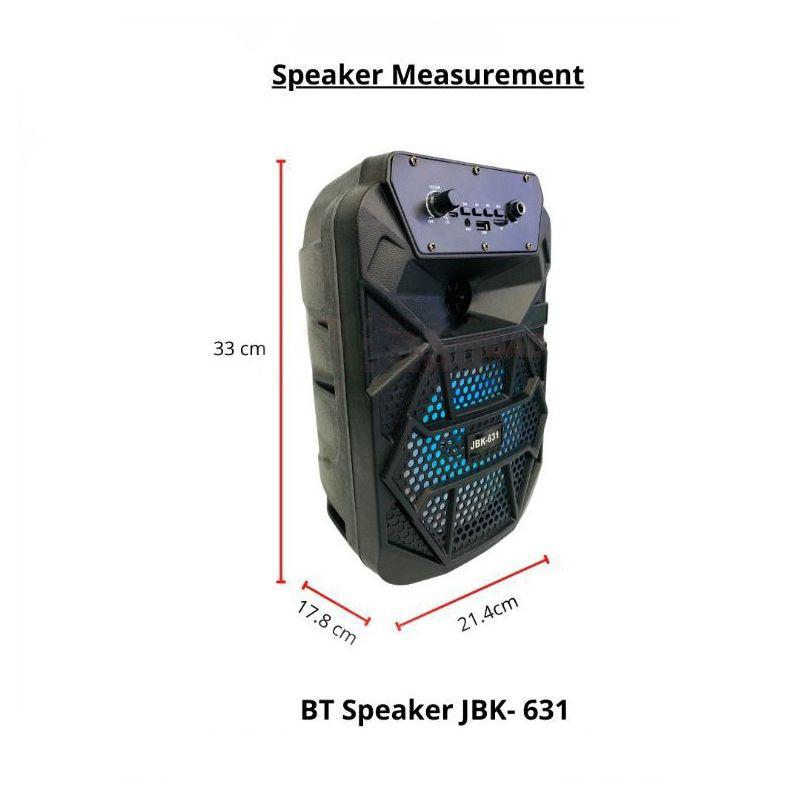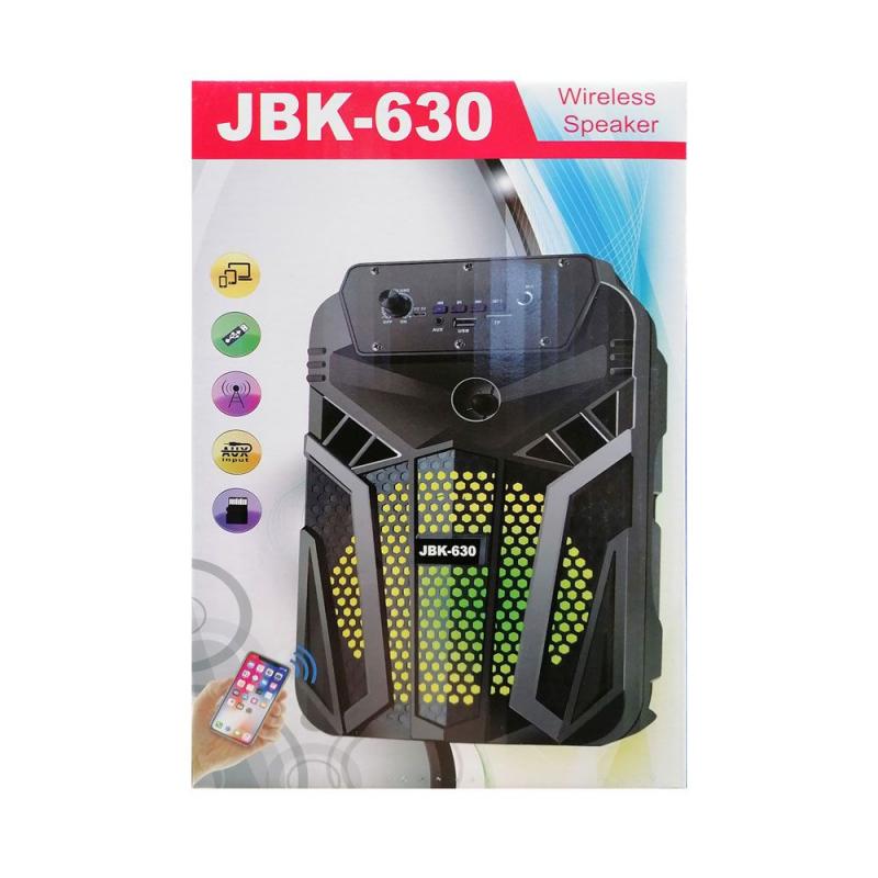 العلامة التجارية: DERISO. الموديل: JBK-630 & JBK-631. حجم السبيكر: 6.5 انش. قدرة المخرج: 5 واط. استجابة التردد: 150 هيرتز – 18 كيلو هيرتز. نسبة الضوضاء: 80 ديسيبل. سعة البطارية: 1500 ملي أمبير. الجهد: DC5V. الشحن يتم باستخدام USB/DC5V كيبل. يدعم البلوتوث من مسافة 10 م. يأتي مع راديو FM. يدعم USB وبطاقة الذاكرة / مشغل بطاقة TF. يدعم مدخل اوكس – 3.5 ملم. يأتي مع مدخل للميكروفون. محتويات الصندوق؟ 1× سبيكر. 1× كيبل شحن.