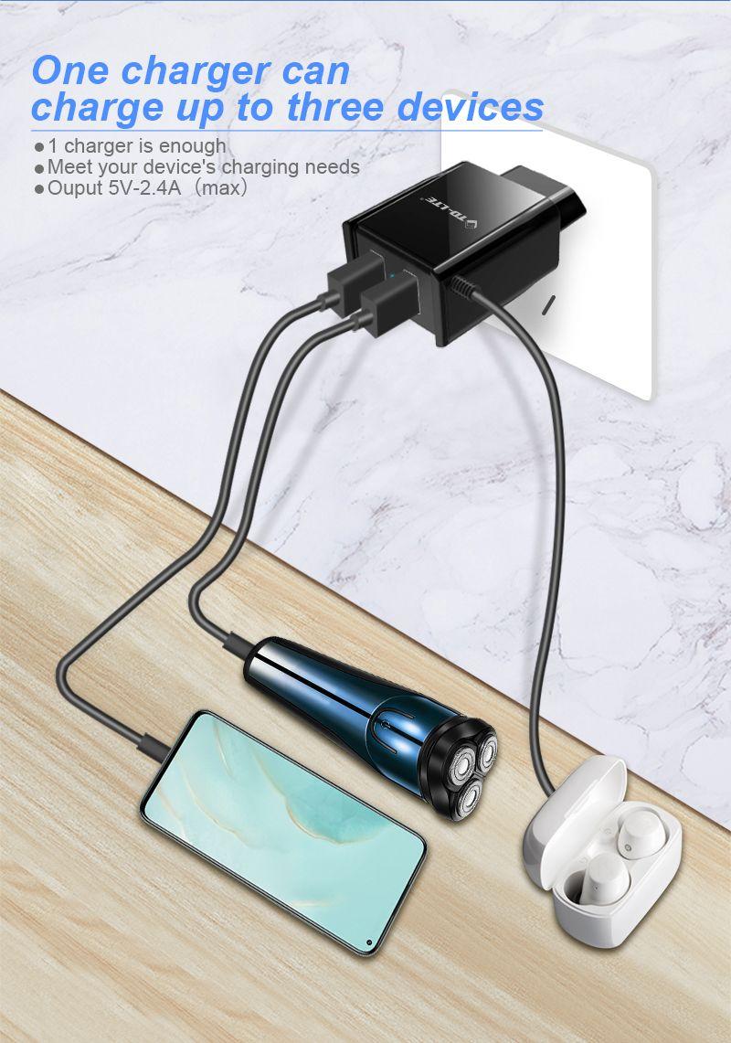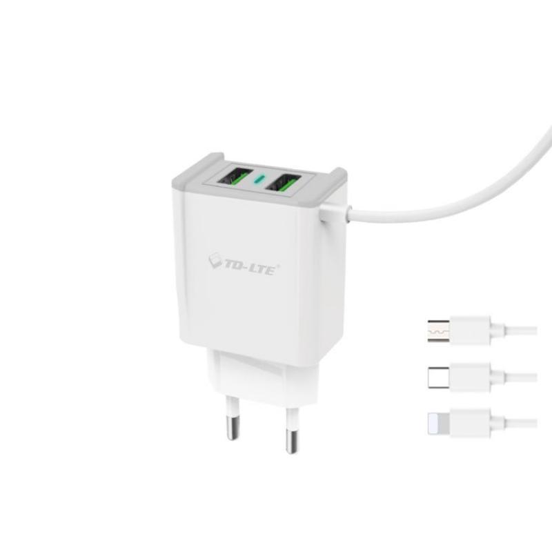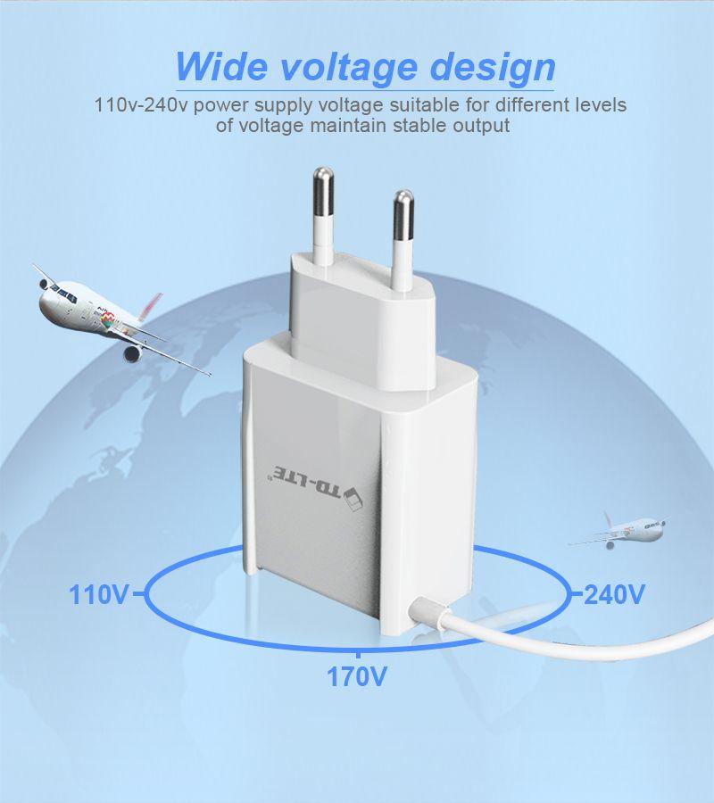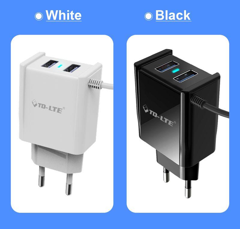 الموديل: TD-75. الطول: .21 متر. المدخلات: 100-264 فولت، 50-60 هيرتز، 0.5 أمبير (كحد أقصى). المخرجات: 5V / 2.4A (كحد أقصى). منفذ (USB): 2 منفذ. درجة حرارة العمل: -10 درجة مئوية ~ 50 درجة مئوية. يتوافق مع: أجهزة Micro-USB، Type-C، Lightning. نوع المحول: EU Plug. هناك ثلاثة أنواع متاحة: Micro-USB Type-C Lightning