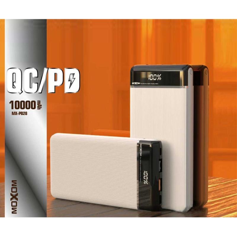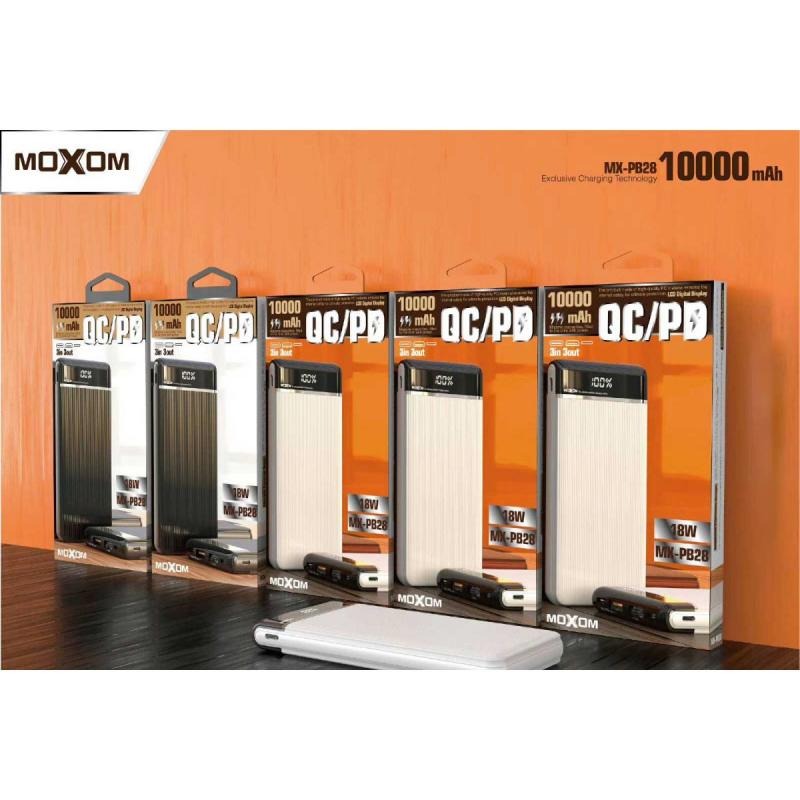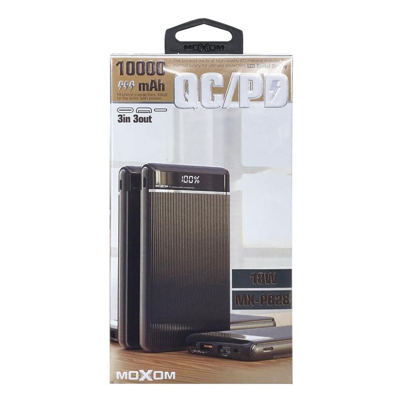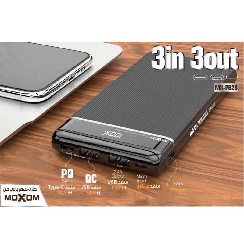 العلامة التجارية: Moxom. الموديل: MX-PB28. سعة البطارية: 10000 ملي أمبير/ساعة. 3 مداخل ( Micro, Type-C, Lightning). مدخل Micro: (2.0 امبير). مدخل Lightning: (2.0 امبير). مدخل Type-C: (PD 18W/QC3.0). مخرج Type-C: (PD 18W/QC3.0). مخرج USB 1: (PD 18W/QC3.0). مخرج USB 2: (2.4A Max). كيبل شحن مجاني بداخل العلبة.